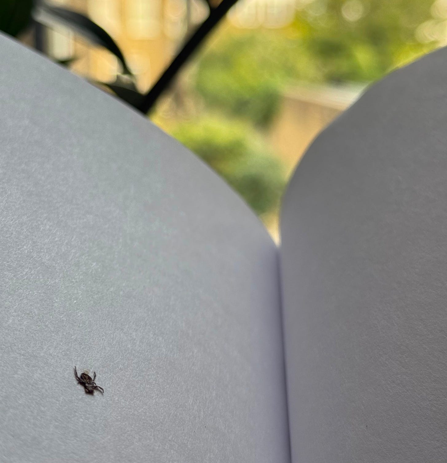 When I opened the book today to grab some quotes I found a dead spider stuck between the pages. Let’s consider it poetic but symbolic of nothing, rather just factual, a little artefact hidden within the book that I believe would appreciate having it inside it.