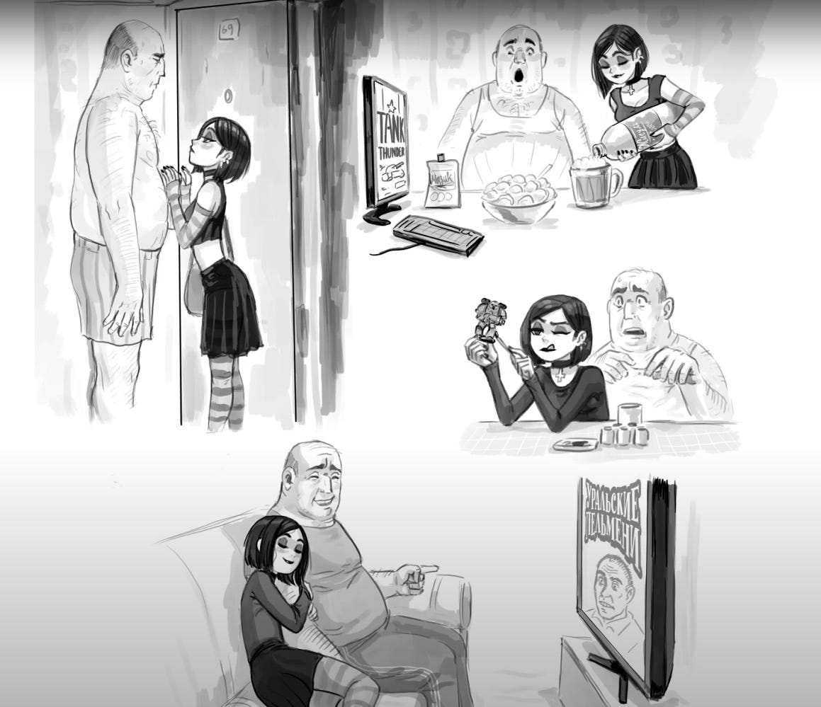 What none of the Western archetypes have is the pair. The incel and the e-girl do not form a meme couple; they exist in separate, hostile ecosystems and want nothing to do with each other. At some point, these two became two halves of a single fantasy, and a rather touching one at that: somewhere out there, in the depths of the internet, an apathetic, balding, paunchy middle-aged man with a beer in one hand and a gamepad in the other and a young, hypersensitive woman, an “aristocrat of spirit”, might actually find each other. Many of today’s skufs were nonconformists in their youth and perhaps that is why they gravitate towards altushkas rather than “normie women”. The skuf is what happens to an aristocrat of spirit when he gives up: opens a beer, sits down at the computer, and nothing hurts any more, or it does hurt, but dully, like a tooth under anaesthesia (beeraesthesia, so to speak).