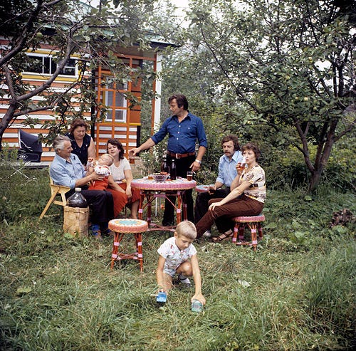A Soviet and post-Soviet phenomenon of a small summer house outside of the city with a garden to grow vegetables and fruits, hang out, have shashlik, and “enjoy” the summer weeding the seedbeds.